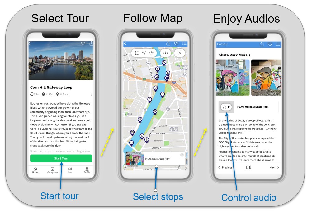 Download the free Tour Blend app, or tap the photo below for the free audio-narrated Corn Hill Gateway Loop tour which follows a 2-mile loop along the Genesee Riverway Trail. The tour takes you upstream to the Ford Street bridge, downstream along the west bank of the river to the Court Street bridge, and then returns to Genesee Gateway Park.